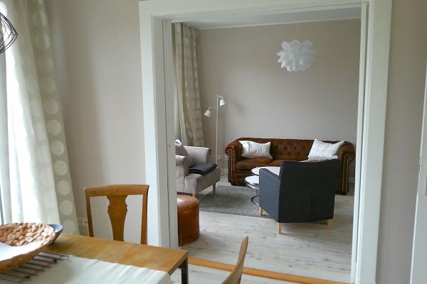 Fewo (69m²) 3. Etage ohne Aufzug, Wohnraum m. Essplatz und Küche. 2 separate Schlafzimmer / 1 Doppelbett und 1 Auszieh-(Doppel)bett, Duschbad / WC. Für max 4 Erwachsene + Kleinkind, WLan und PKW Stellplatz, Strandkorb