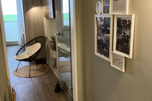 Moderne Ferienwohnung (55m²) 3. Etage, Seesicht. Wohnraum m. integrierter Küche + Essplatz. Zusätzliche Schlafgelegenheit im Wohnraum. Separates Schlafzimmer / Doppelbett. Duschbad / WC. Für 2 - 4 Personen. Kostenloses WLan und einer Garage für den PKW
