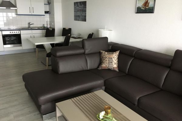 Ferienwohnung ca. (65 m²), 3. Etage, Seesicht mit Balkon, Wohnraum mit int. Küche, Essplatz, separates Schlafzimmer mit Doppelbett, Duschbad/WC, Schlafsofa im Wohnraum, Kabel-TV, Radio, Fön, TG Stellplatz, WLAN