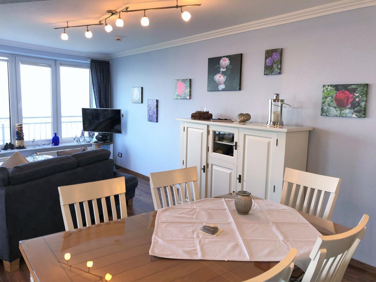 Willkommen in dieser geschmackvollen Ferienwohnung im Haus Seeterrassen, gelegen in der 2. Etage. Der große Balkon bietet Ihnen die Möglichkeit, die frische Nordseeluft und den Blick auf das Meer zu genießen. Mit einer Fläche von rund 79 m² erwartet Sie ein großzügiger Wohnbereich mit integriertem Essplatz, ein Schlafzimmer mit einem komfortablen Doppelbett (2 x 90 x 200 cm) (erhöht) und einem großen Kleiderschrank sowie ein modernes Duschbad mit Regendusche und bodengleichem Zugang.